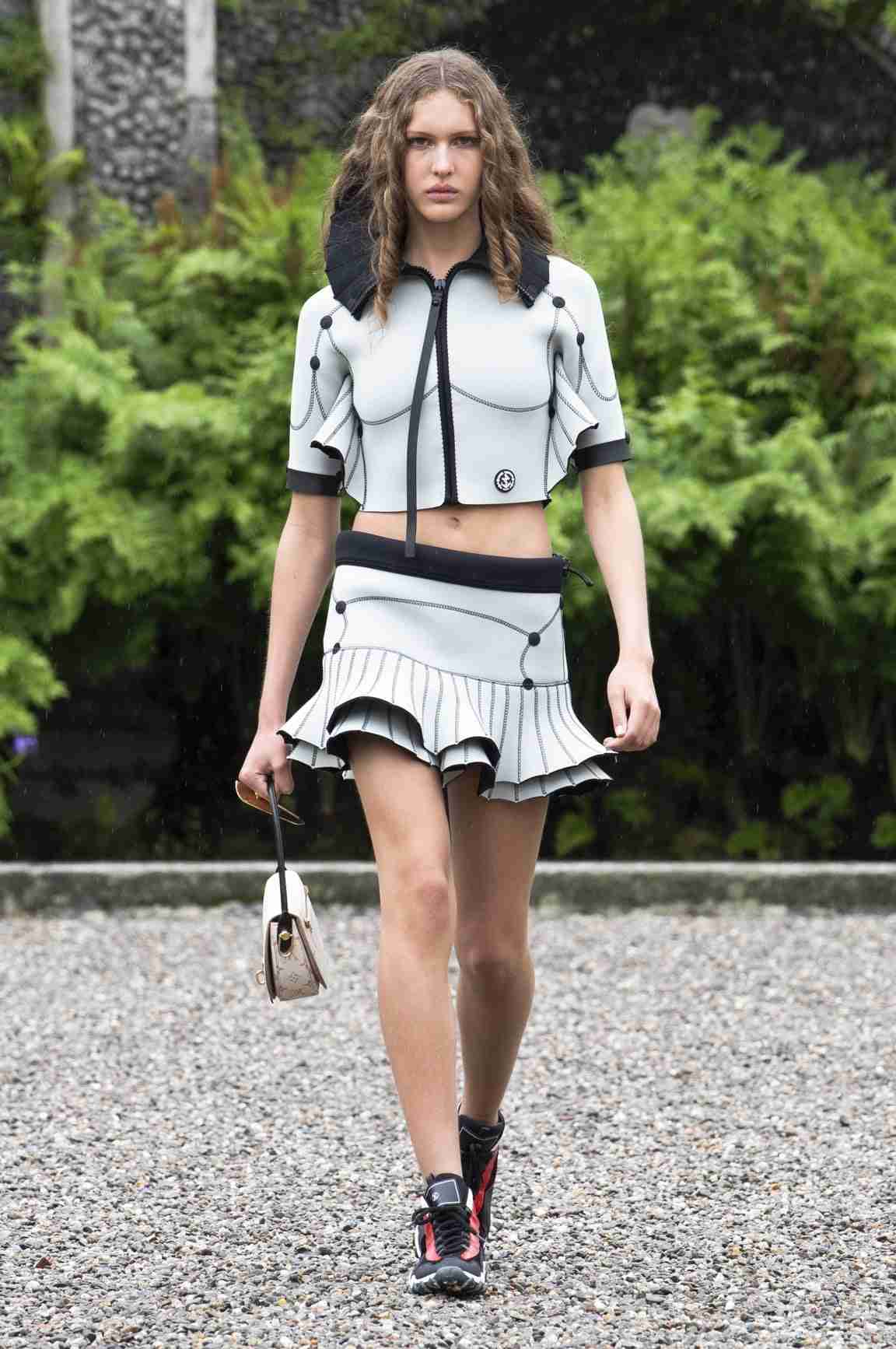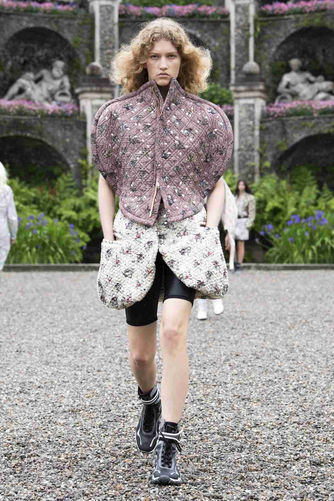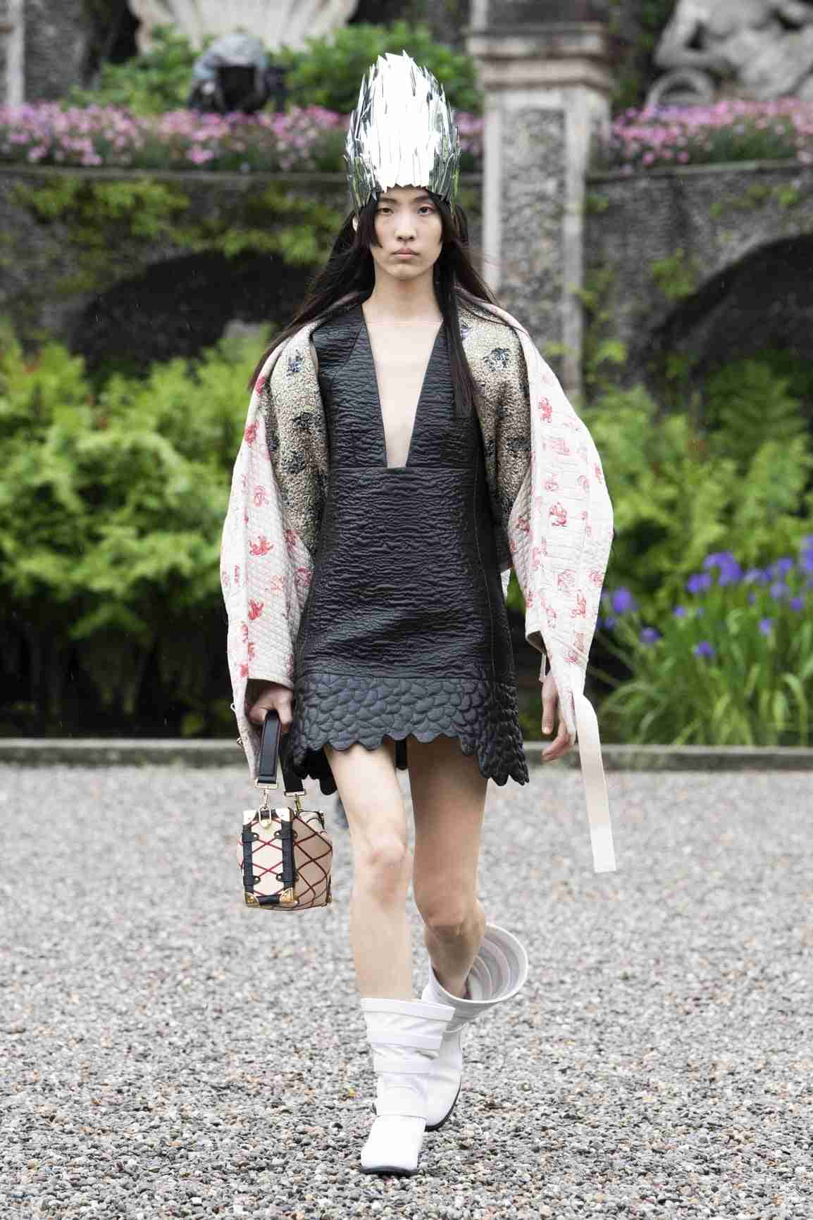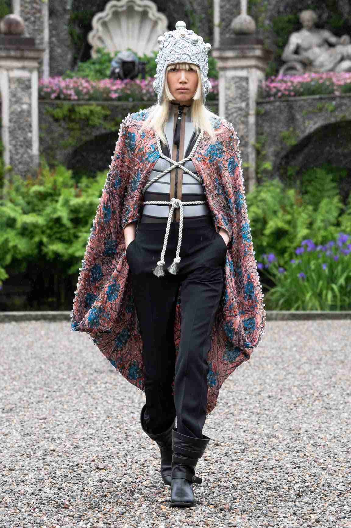 Creative Director Nicolas Ghesquière created fantastical looks that give “rise to contemporary tales, populated by drifting creatures that abandon aquatic dwellings for the discovery of terrestrial wonders.” Garments were made to be worn seaside, rendered in neoprene with webbed, almost amphibious collars. Some models walked the runway in towering headpieces, while quilted fabrics and structured jackets brought to mind the medieval fairy tales of childhood.