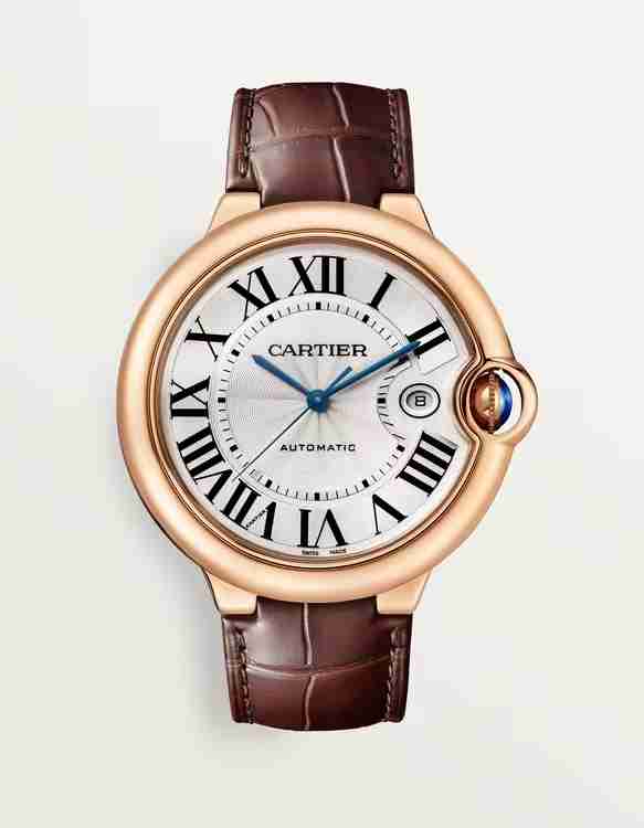 Large-format “Ballon Bleu de Cartier” featuring a rose gold case set with a cabochon sapphire, silver guilloché lacquered opaline dial and a brown alligator leather strap. Option to engrave. $$17,600; cartier.com.