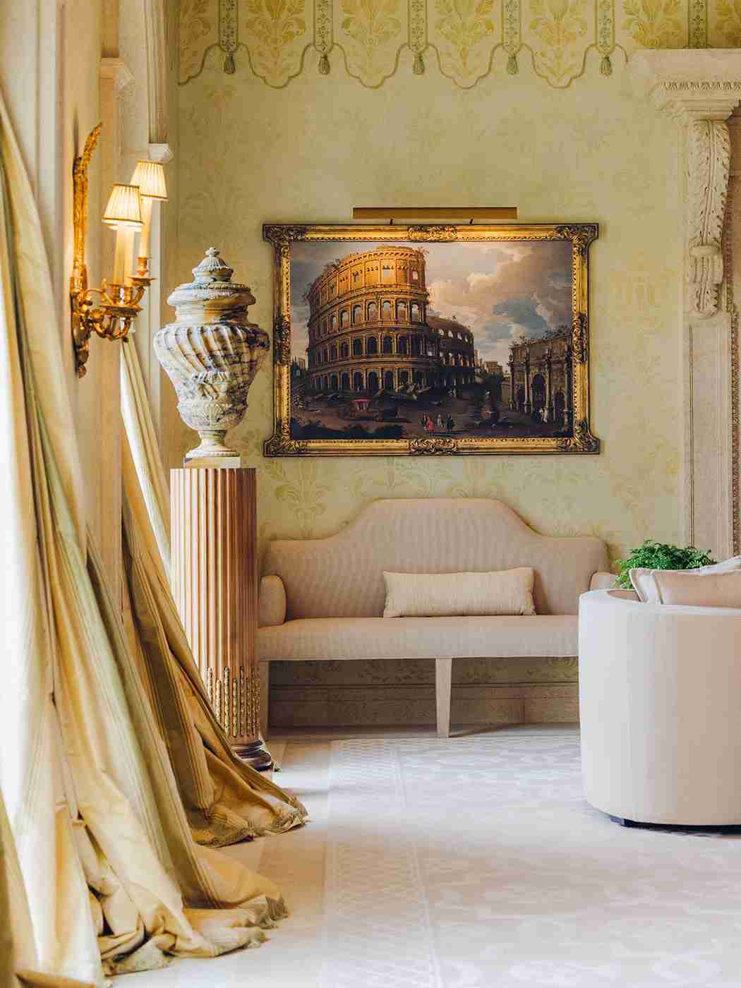 Yes, in the atrium is the exceptional contemporary Pistoletto diptych, “Two Less One Colored.” One panel features Neapolitan yellow pigment, the other, Mediterranean blue, with a broken mirror and framed in a classical gold frame—a prime example of old and new working together beautifully. The atrium has handmade blue and yellow ceramic tile on the walls from Sicily that show birds that are surrounded by grapes and greenery. There are also antique 19th-century terracotta urns and a pair of niches. At the end of the gallery, there is a life-size 1st-century Roman statue, depicting a woman draped in her toga.