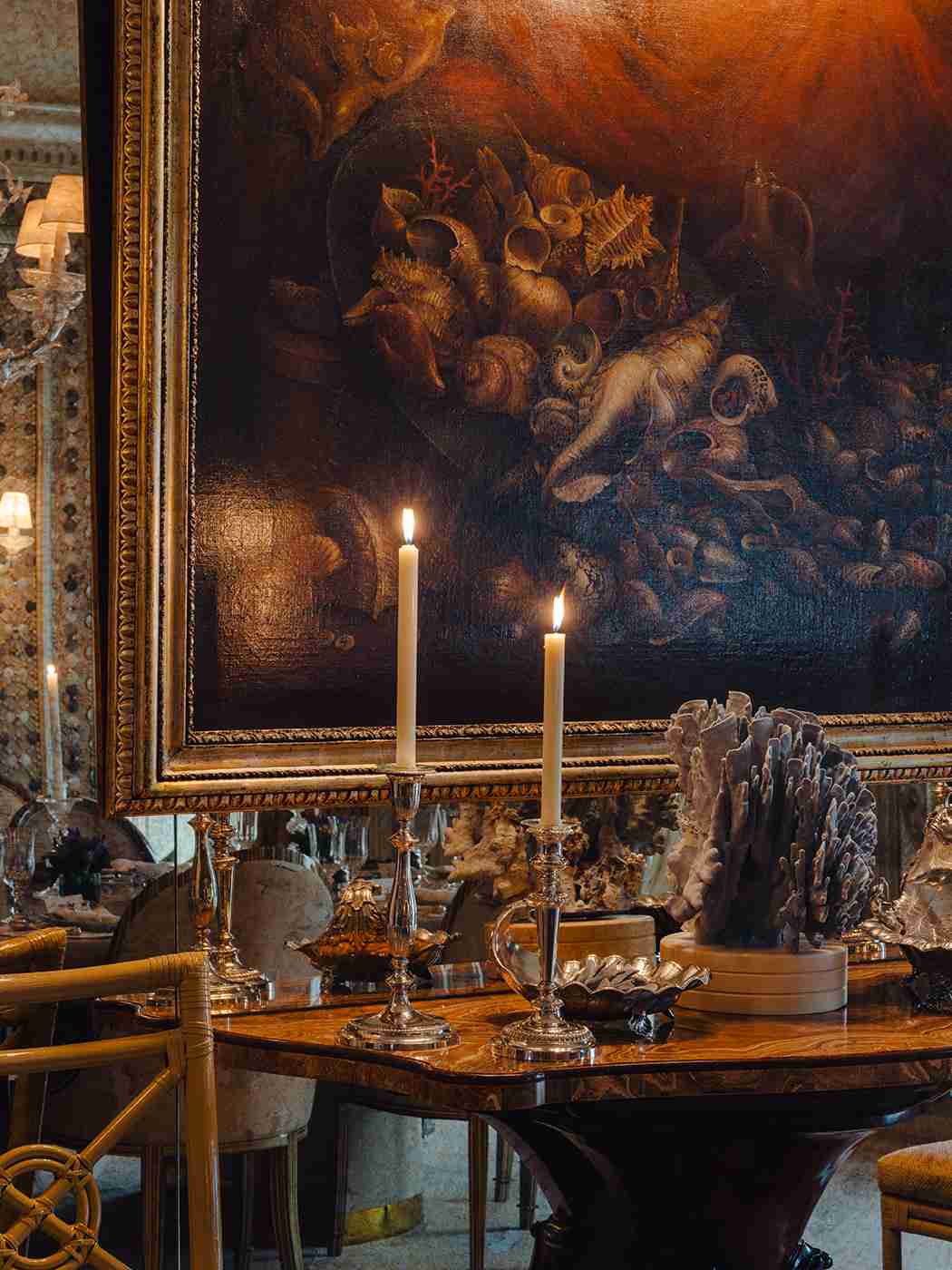 Martin and I have always wanted something of a grotto feeling in the house. We were thrilled when our de- signer came up with the concept of an entire dining room in shells. Martin and I were walking down Via del Babuino in Rome, and we couldn’t believe we saw these 17th-century Dutch paintings that showed collections of shells. They’re now in the dining room.