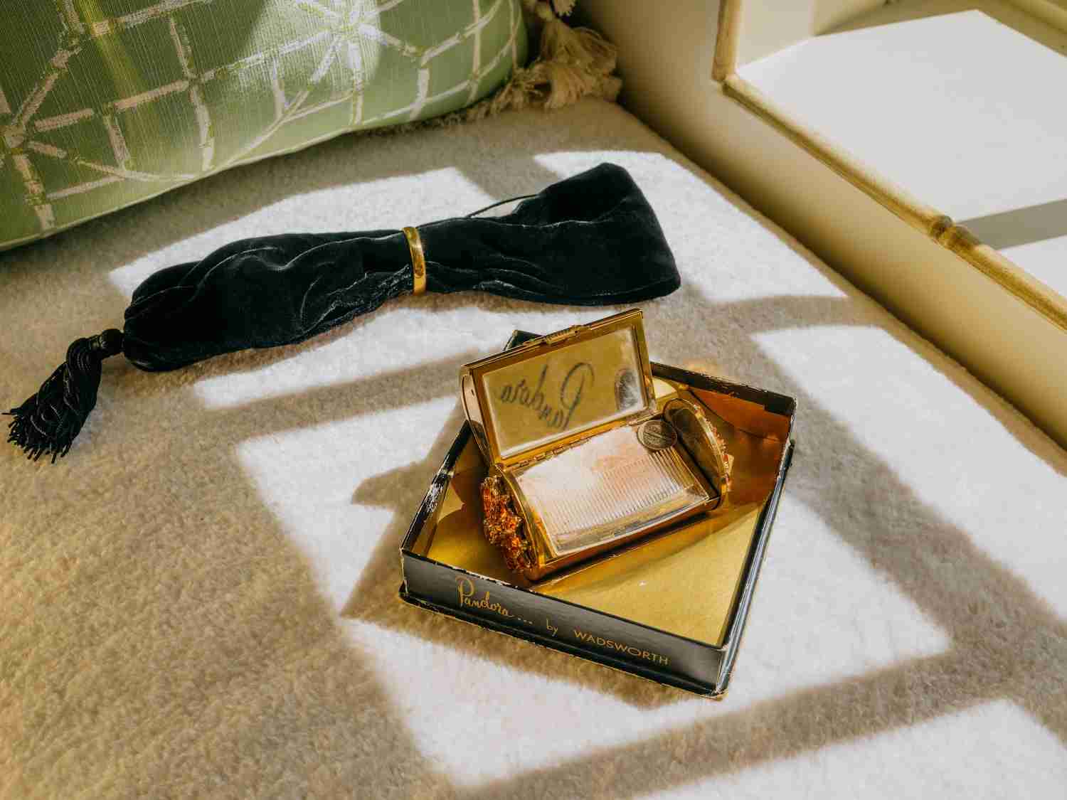 “I have a picture of Marilyn Monroe wearing this bag. It’s got a missing stone, and these crazy compartments, but you open it and it still has two dimes of hers—this is from when you’d use a dime for a phone call. And then she’s got her lipstick, and her comb, and her unfiltered cigarettes. Isn’t that fun? It’s a piece of history. For me it’s like an artifact; it’s a treasure.”