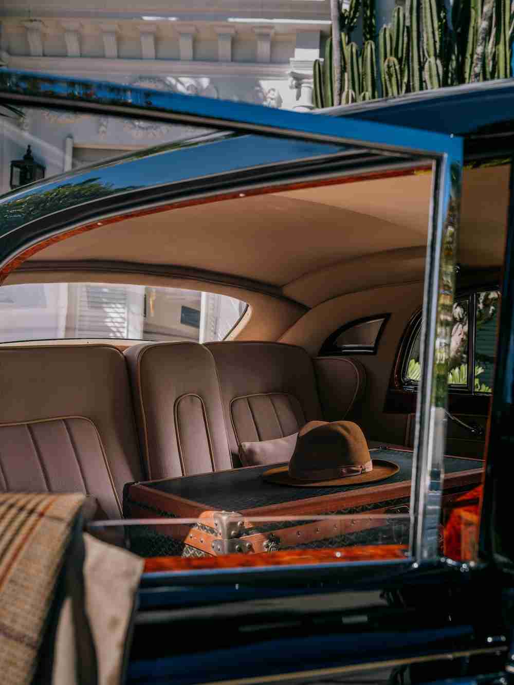 “The car was originally built for my great aunt, and it lived in Paris in the 1950s and ’60s. I had it restored about 20 years ago. I have great memories of riding in the car when I was a young man in Europe. The Goyard trunk dates back from the late 1920s or early ’30s. It was originally purchased by my grandfather and his initials are on it in red. The hat I purchased from Lock [& Co.] in London and the sports jacket is an old tweed made for me in London in the ’70s.”
