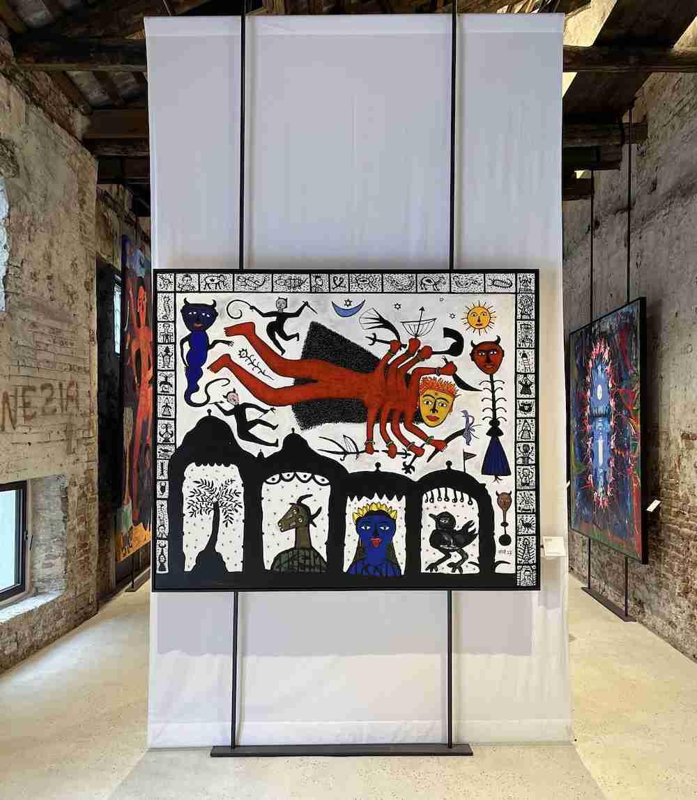 But the best part of the Biennale is serendipity, wandering the twisty alleys of Venice and stumbling on collateral events: unexpected art in extraordinary places. Near the Rialto, the Chanakaya Foundation’s “Cosmic Garden,” paintings and sculptures by Madhvi Parekh and Manu Parekh brings Indian traditions into the present. Heumin’s Dream Cathedral in the Chiesa di San Giovanni Evangelista, mixes interactivity, artificial intelligence and its dramatic setting, allowing visitors to imagine images, speak them into a microphone and then see them realized on screens erected on the church altar.