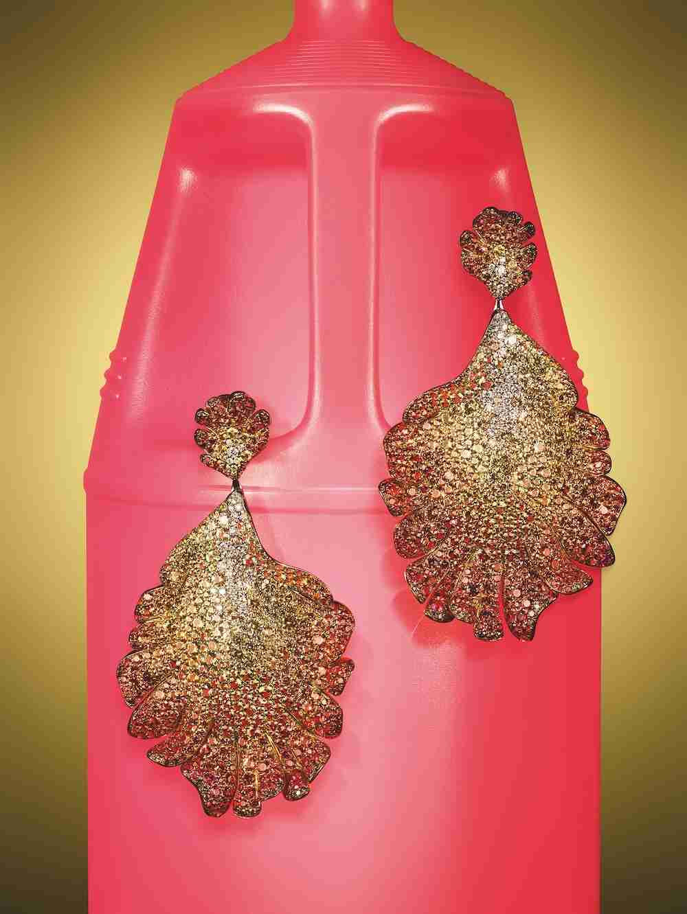 Chopard earrings in 18K white gold and titanium with orange and yellow sapphires and diamonds.
