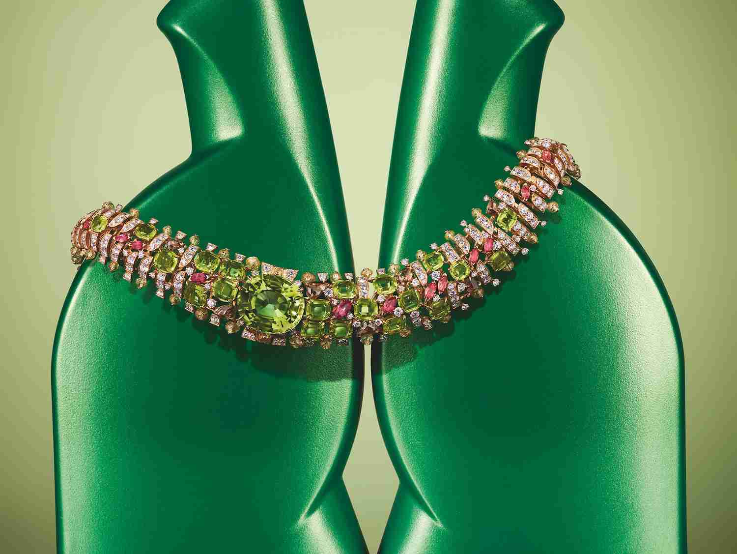 Cartier necklace in 18K yellow gold with tourmaline, peridot, sapphires, and diamonds.