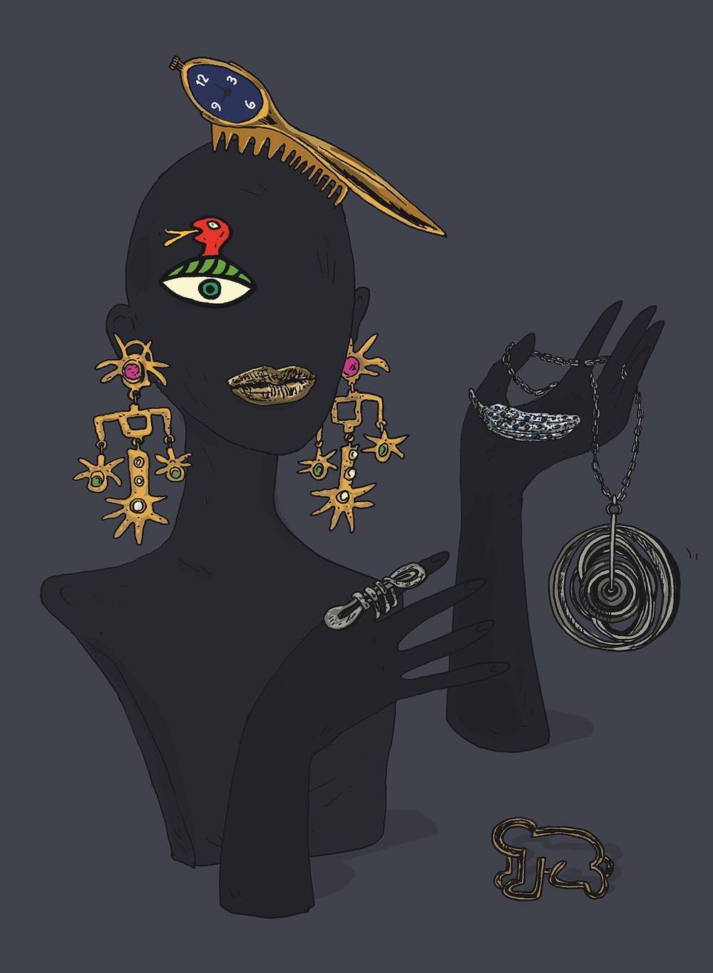 Hair brooch: “Montre Petite Cuillère,” 1957, by Salvador Dalí. Eye brooch: “L’oeil,” 1991, by Niki de Saint Phalle. Lip brooch: “Untitled (Labbra),” 2012, by Jannis Kounellis. Earrings: “Untitled,” 1950s, by Afro. Ring: “Untitled,” 1940s, by Alexander Calder. Brooch (in right hand): “Cucumber,” 2014, by Erwin Wurm. Necklace (in right hand): “Hopeakuu (Silver Moon),” 1970, by Tapio Wirkkala. Brooch (on ground): “Crawling Baby,” 1989, by Keith Haring.