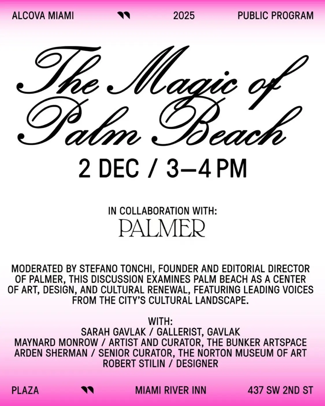 Moderated by PALMER’s very own Editorial Director and Co-Founder Stefano Tonchi, this discussion examines Palm Beach as a center of art, design, and cultural renewal, featuring leading voices from the city’s cultural landscape. The panel will consist of: