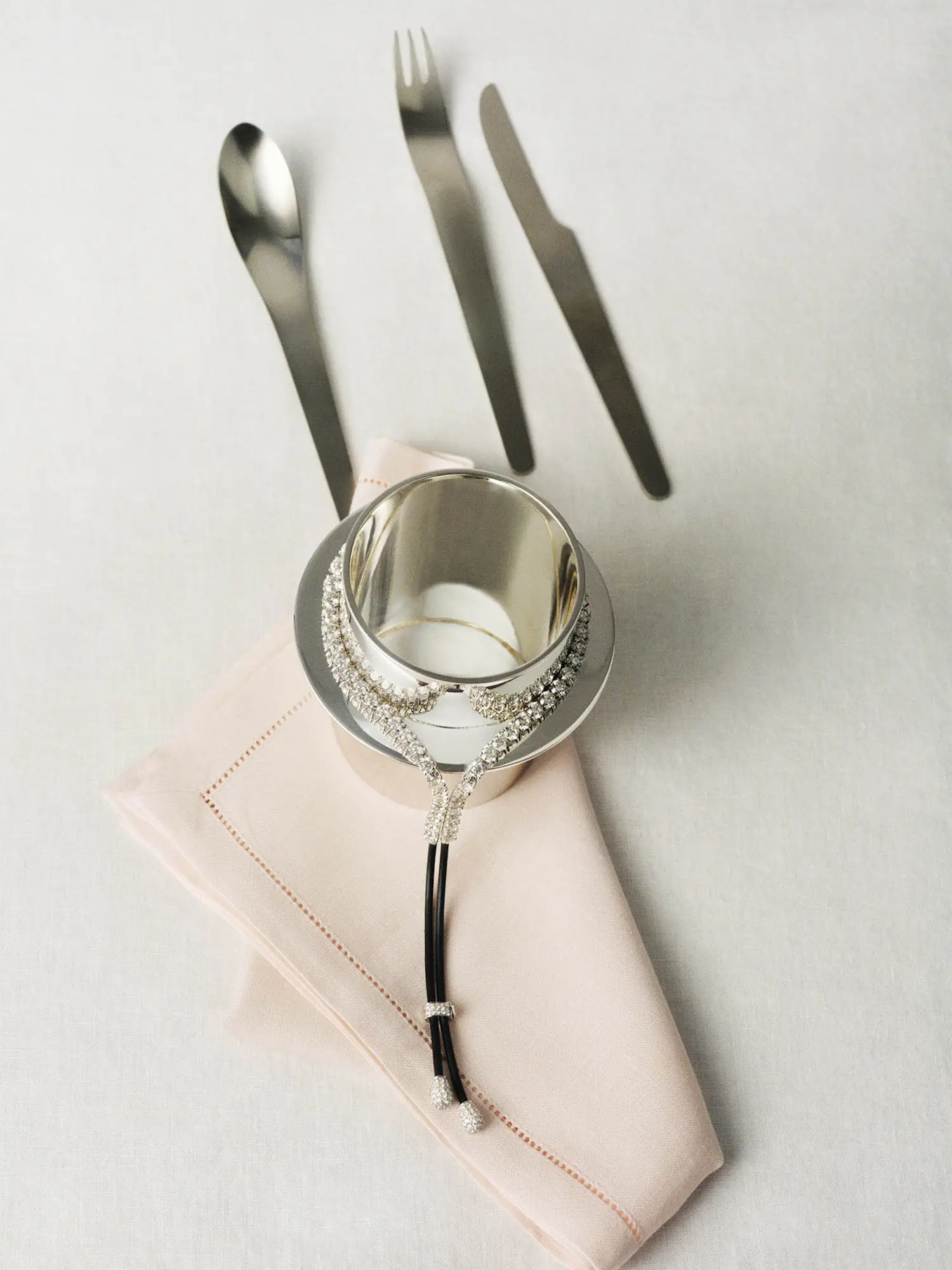 BRILLIANT ROUND DIAMOND & RUBBER LARIAT NECKLACE IN 18K WHITE GOLD AND RUBBER WITH DIAMONDS LUGANO DINNER SERVICE CUP IN STERLING SILVER PUIFORCAT VINTAGE FLATWARE