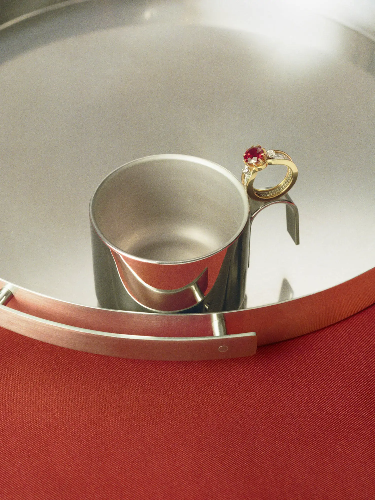 JEAN SCHLUMBERGER BY TIFFANY BASKET PAVÉ SHANK RING IN YELLOW GOLD AND PLATINUM WITH AN UNENHANCED RUBY AND DIAMONDS TIFFANY & CO. VINTAGE TRAY AND CUP