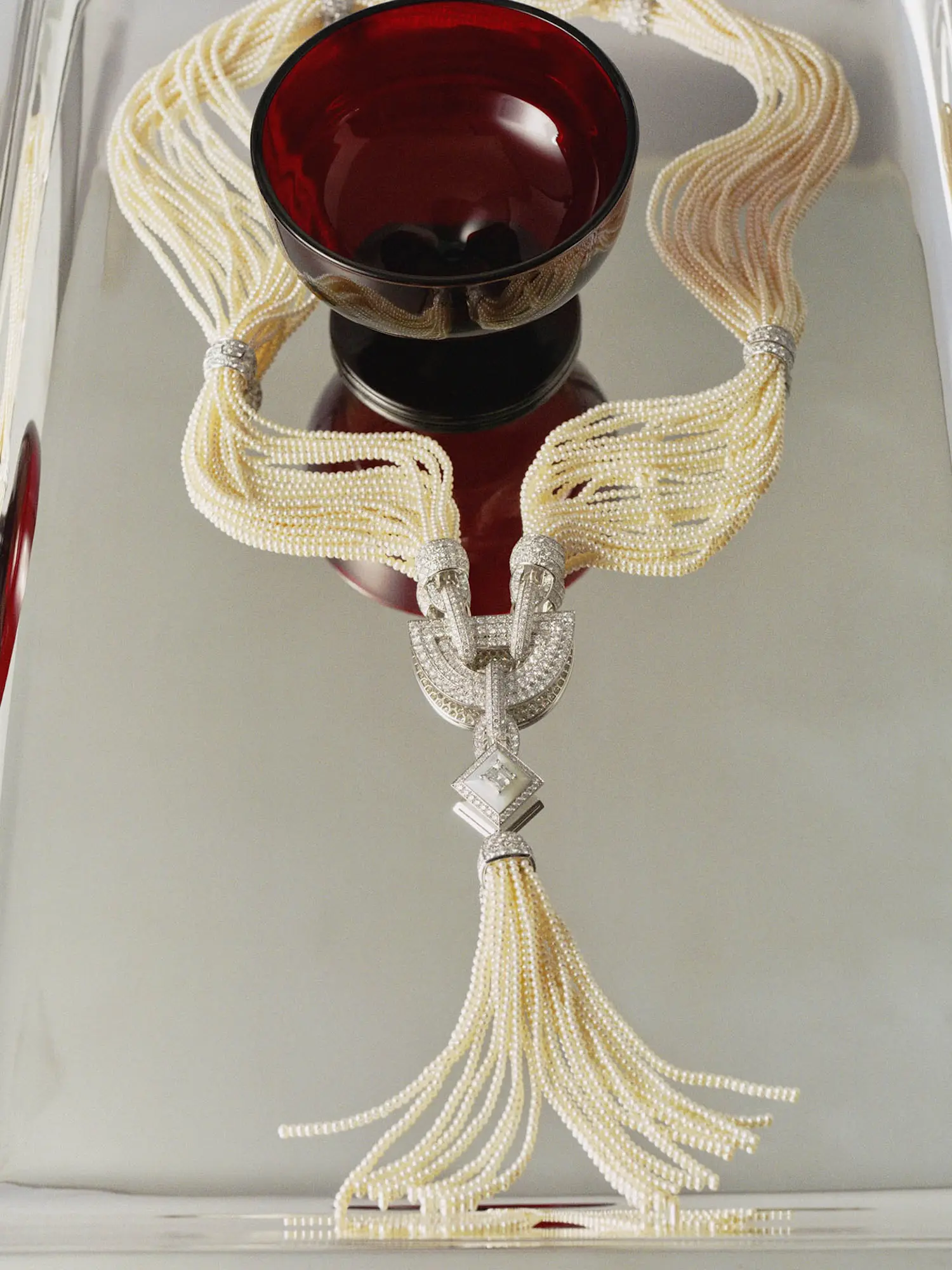 ARCADES HIGH JEWELRY NECKLACE IN WHITE GOLD WITH FRESHWATER PEARLS, MOTHER OF PEARL, AND DIAMONDS BOUCHERON EUCLIDE RECTANGULAR TRAY IN SILVER PLATE PUIFORCAT VINTAGE CUP