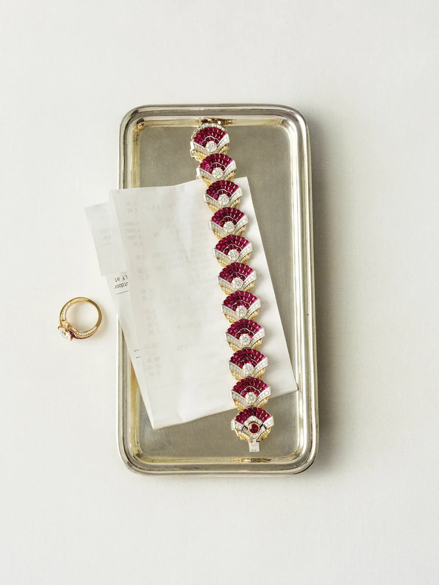 ABOVE: COQUILLES MYSTÉRIEUSES BRACELET IN 18K WHITE GOLD AND 18K ROSE GOLD WITH RUBIES AND DIAMONDS AND TOURBILLON PRÉCIEUX RUBIS RING IN 18K ROSE GOLD WITH RUBIES AND DIAMONDS VAN CLEEF & ARPELS SET DESIGNER’S OWN TRAY