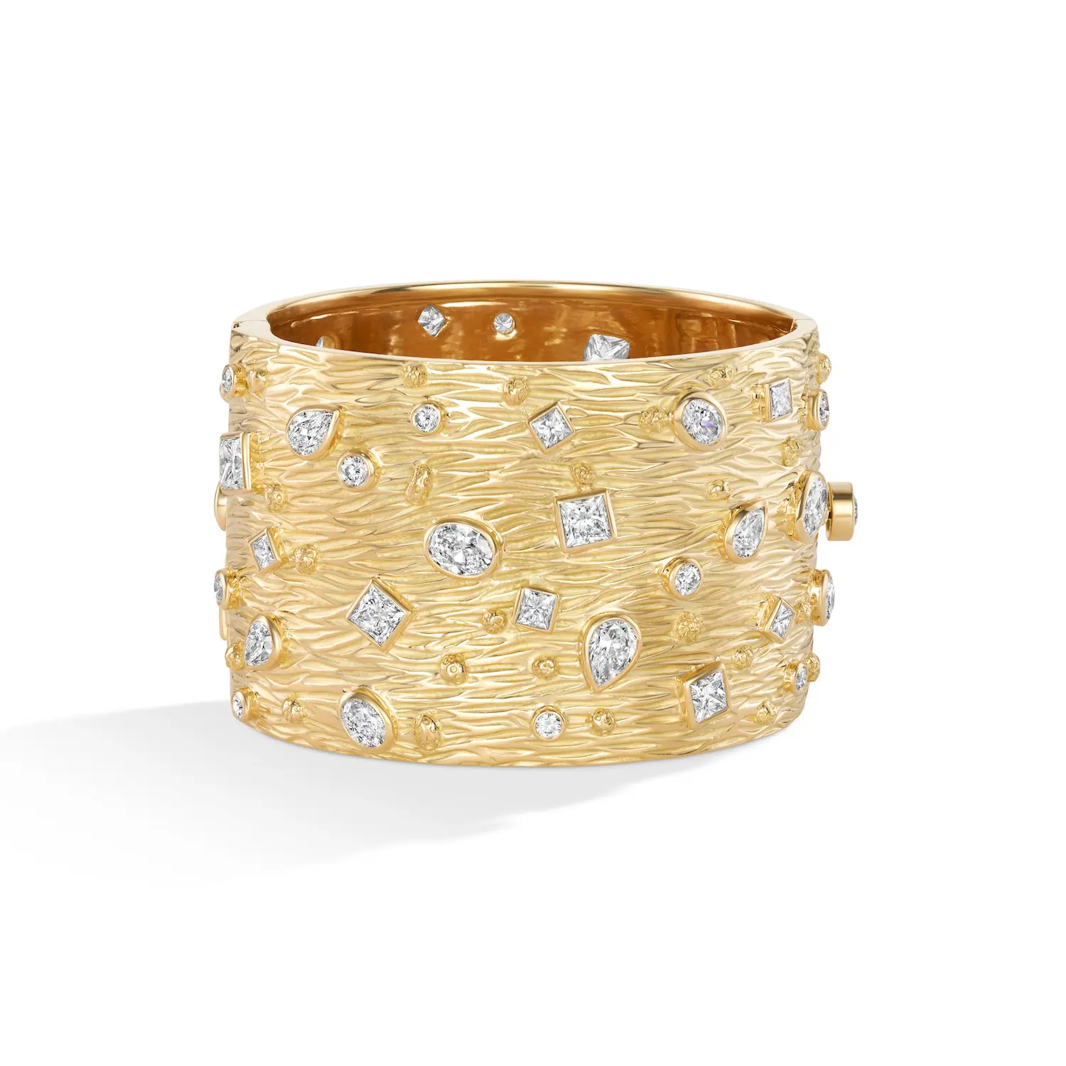 Mish Fine Jewelry Jeweled Bark Cuff in 18k yellow gold and diamonds; $285,000 USD. Available at Mish Fine Jewelry, 244 South County Road, Palm Beach.