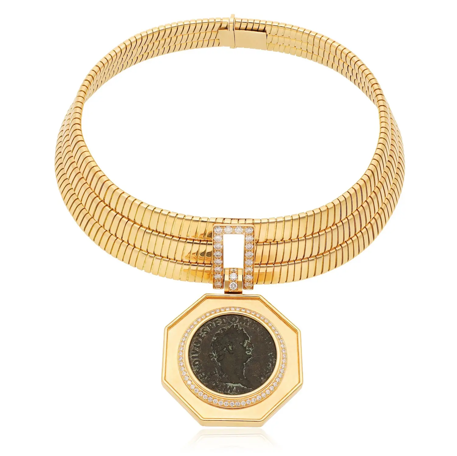 Bulgari Tubogas Necklace with Ancient Domiziano Coin Pendant 81–96 AD; $575,000 USD. Available at YAFA Signed Jewels, 234 Worth Ave, Palm Beach.