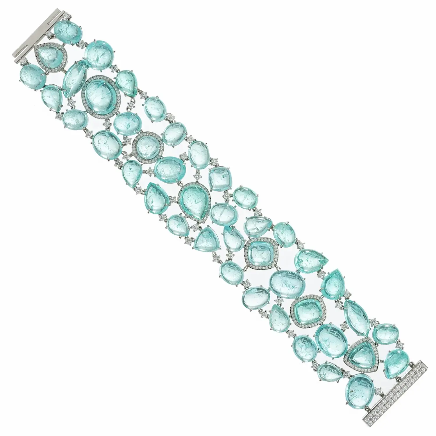 Paraiba Tourmaline Diamond 3-Row Bracelet; $544,000 USD. Available at Greenleaf & Crosby, 236 Worth Avenue, Palm Beach